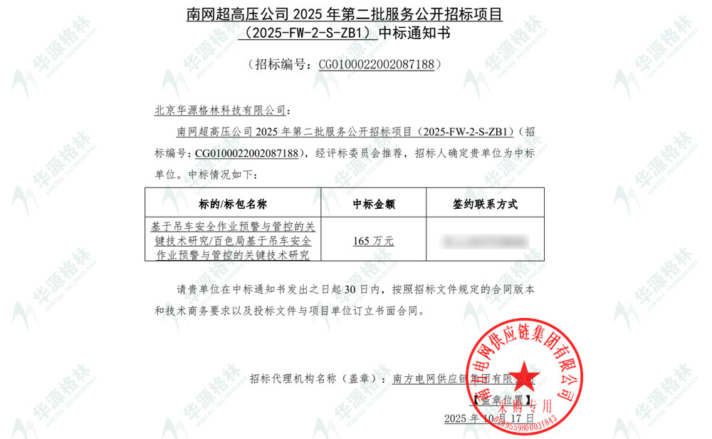 北京华源格林科技有限公司及其子公司(广州华源格林科技有限公司)凭借公司良好的信誉、行业经验、强大技术实力、完善的服务标准赢得了评标专家和招标方的肯定,于2025年10月17日顺利中标中国南方电网超高压输电公司百色局-基于吊车安全作业预警与管控的关键技术研究项目。