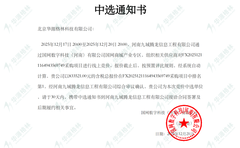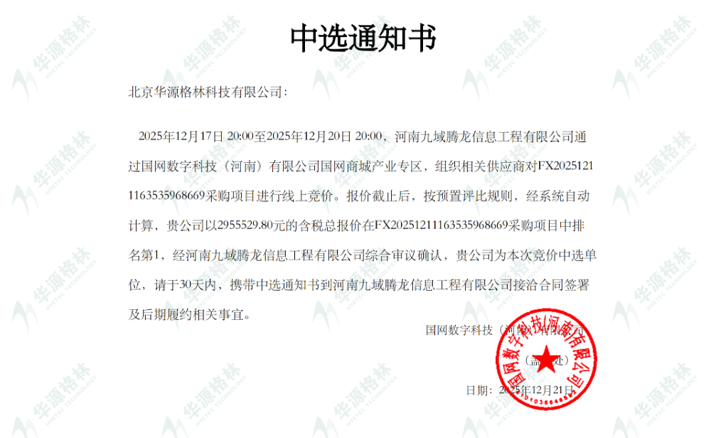 北京华源格林科技有限公司及其子公司(广州华源格林科技有限公司)凭借公司良好的信誉、行业经验、强大技术实力、完善的服务标准赢得了评标专家和招标方的肯定,于2025年12月21日顺利中标河南九域腾龙信息工程有限公司-大模型驱动的电力通信检修全环节智能辅助决策项目和2025年国网河南信通分公司数字化业务系统整合实施服务项目。