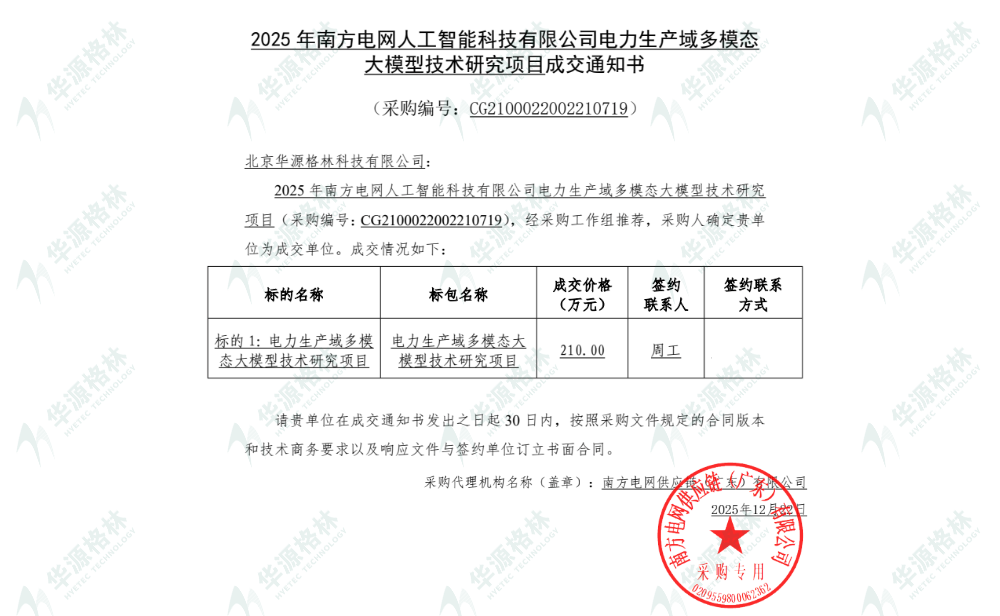 北京华源格林科技有限公司及其子公司(广州华源格林科技有限公司)凭借公司良好的信誉、行业经验、强大技术实力、完善的服务标准赢得了评标专家和招标方的肯定,于2025年12月22日顺利中标南方电网人工智能科技有限公司-电力生产域多模态大模型技术研究项目。