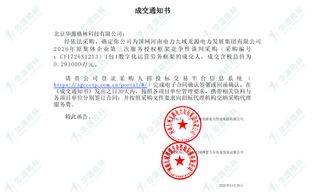 北京华源格林科技有限公司凭借公司良好的信誉、行业经验、强大技术实力、完善的服务标准赢得了评标专家和招标方的肯定,于2026年03月26日顺利中标河南九域腾龙信息工程有限公司-数字化运营劳务框架、智能技术服务劳务框架。