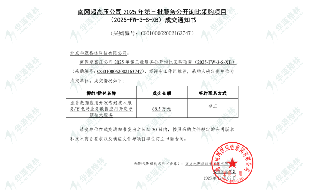 北京华源格林科技有限公司及其子公司(广州华源格林科技有限公司)凭借公司良好的信誉、行业经验、强大技术实力、完善的服务标准赢得了评标专家和招标方的肯定,于2025年12月09日顺利中标中国南方电网超高压输电公司百色局-百色局业务数据应用开发专题技术服务。