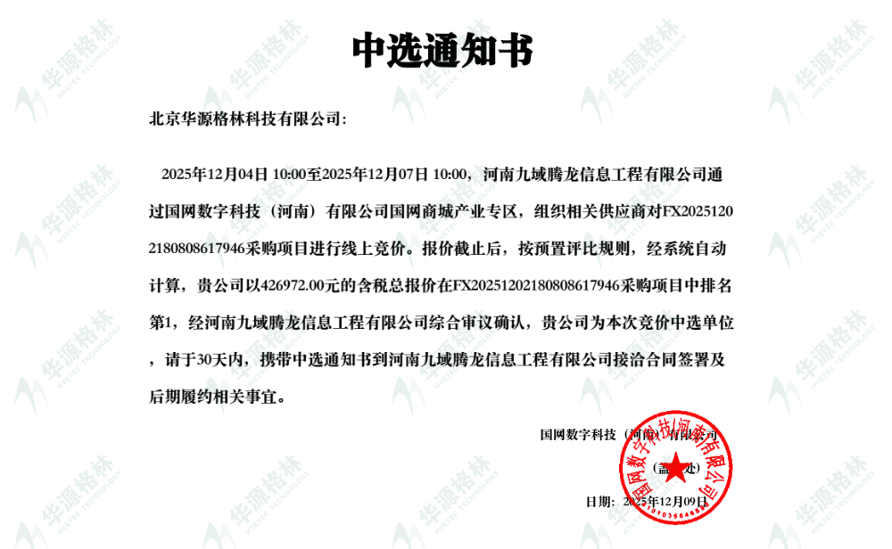 北京华源格林科技有限公司及其子公司(广州华源格林科技有限公司)凭借公司良好的信誉、行业经验、强大技术实力、完善的服务标准赢得了评标专家和招标方的肯定,于2025年12月09日顺利中标河南九域腾龙信息工程有限公司-技术监督数据接入与分析应用。