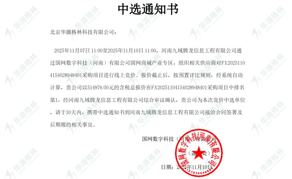 北京华源格林科技有限公司及其子公司(广州华源格林科技有限公司)凭借公司良好的信誉、行业经验、强大技术实力、完善的服务标准赢得了评标专家和招标方的肯定,于2025年12月09日顺利中标河南九域腾龙信息工程有限公司-设备跳闸精度提升及录波数据接入分析。